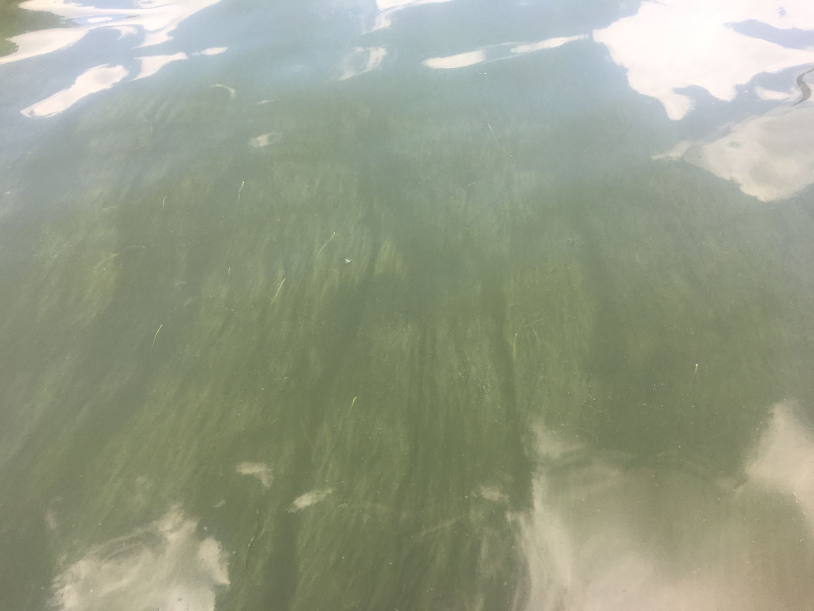 Friday was fantastic – great water and beautiful sunshine. We fought our floaties all day though, so we decided to rent a lily pad on Saturday to make our time in the water a little easier. But as we trucked the rented water toy down the dock, I expressed concern at the color and consistency of the water. Gone was the deep navy blue with green plants waving from below. Gone was the reflection of blue sky, pearly clouds, and bright sunshine. In its place: green, streaky goop that stretched from the shoreline to far beyond the dock.